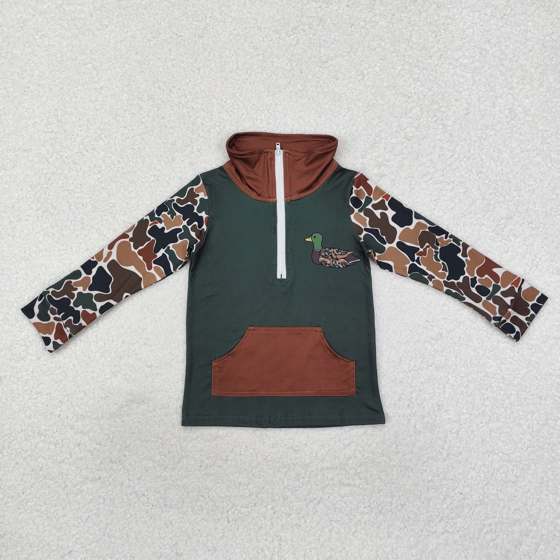 BT0927 Dark Green Camo Duck Print Boys Pocket Zipper Pullover Top