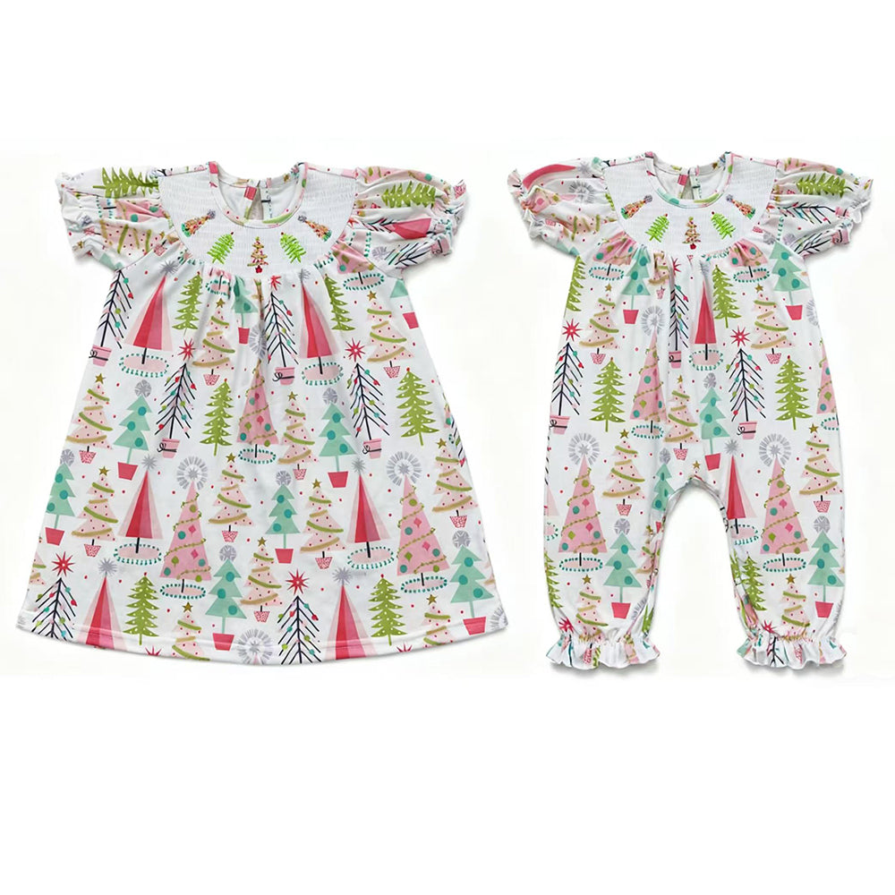 Colorful Tree Embroidery Sisters Christmas Smocked Matching Clothes