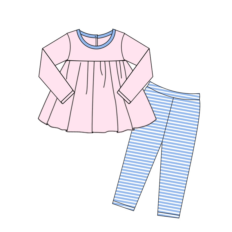 (Custom Design MOQ 5) Pink Tunic Blue Stripes Legging Pants Girls Clothes Set
