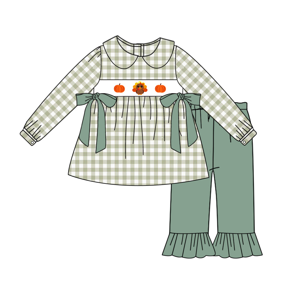 (Custom Design MOQ 5) Turkey Pumpkin Tunic Top Green Pants Girls Thanksgiving Clothes Set