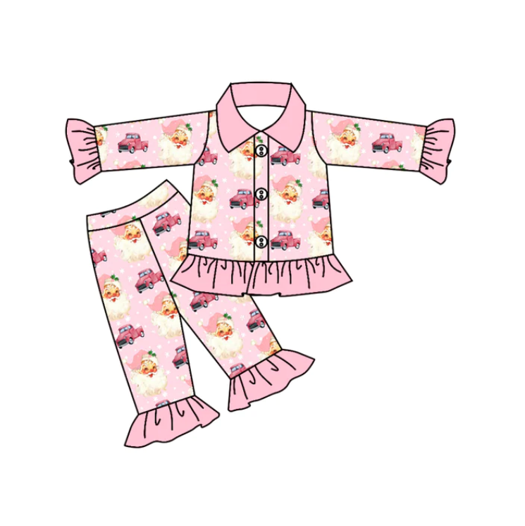 (Custom Design MOQ 5) Pink Santa Girls Button Christmas Pajamas Clothes Set