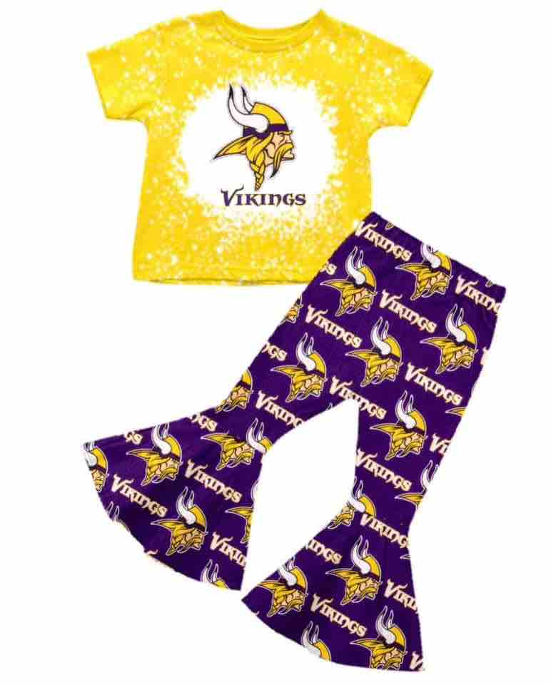 (Custom Design MOQ 5) Yellow Purple Football Team's Print Girls Bell Pants Clothes Set