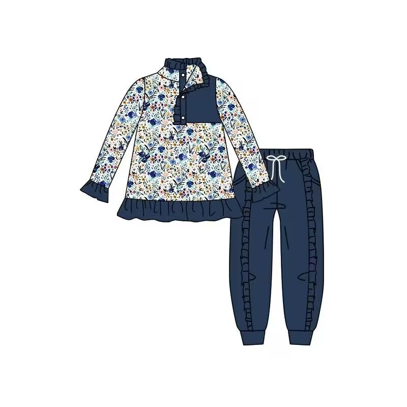 (Custom Design MOQ 5) Navy flowers print button pullover shirts pants girls fall clothes set