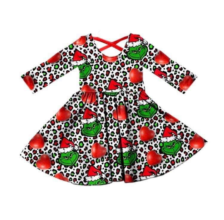 (Custom Design MOQ 5) Christmas Frog Face Leopard Print girls knee length dress
