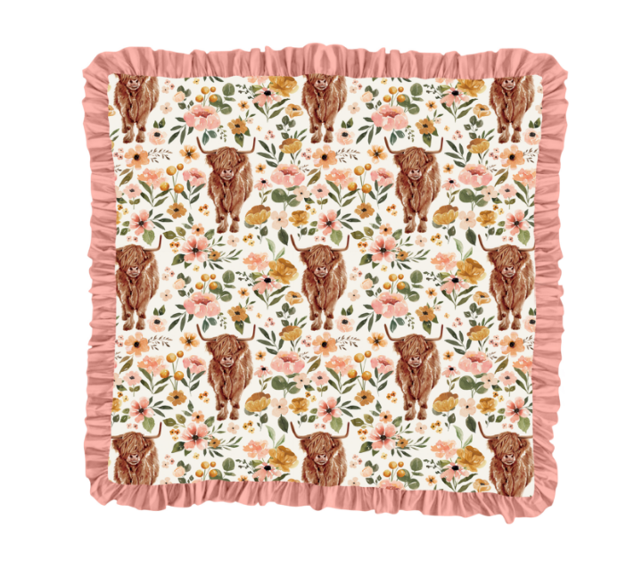 (Custom Design MOQ 5) Highland Cow Flowers Print Baby Girls Ruffle Blanket