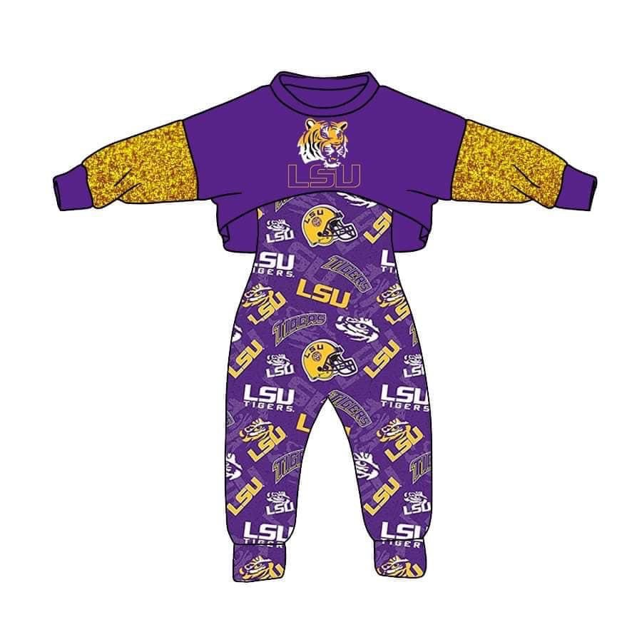 (Custom Design MOQ 5) Purple Football Team's Girls Jumpsuits Clothes Set