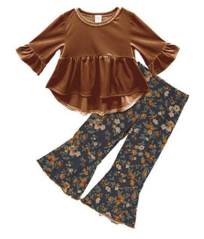 (Custom Design MOQ 5) 3/4 Sleeve Brown Velvet Tunic Top Flowers Pants Girls Fall Clothes Set