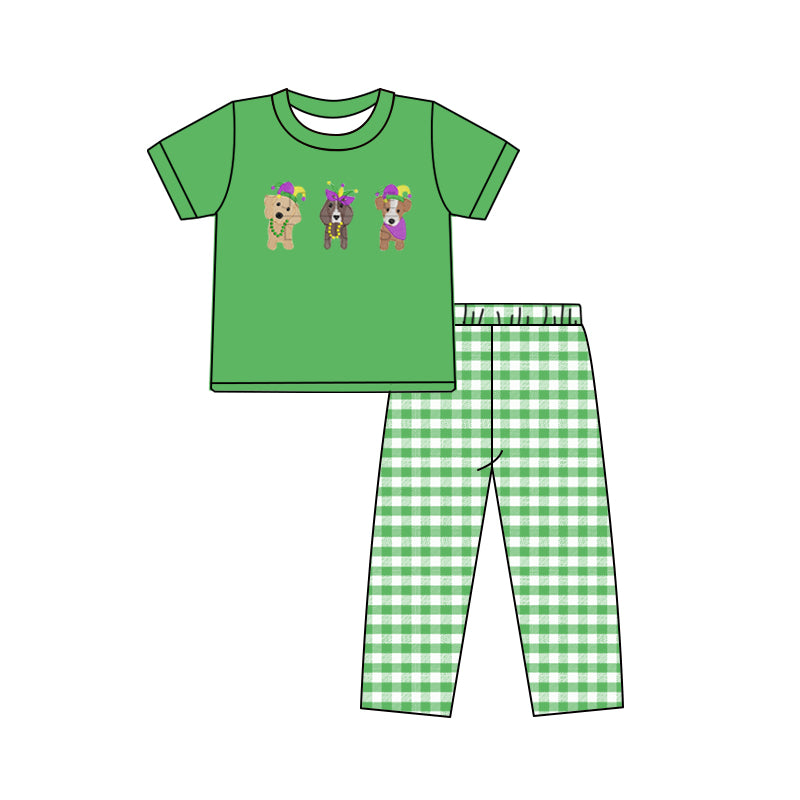 (Custom Design MOQ 5) 3 Dog Print Top Plaid Pants Boys Mardi Gras Clothes Set