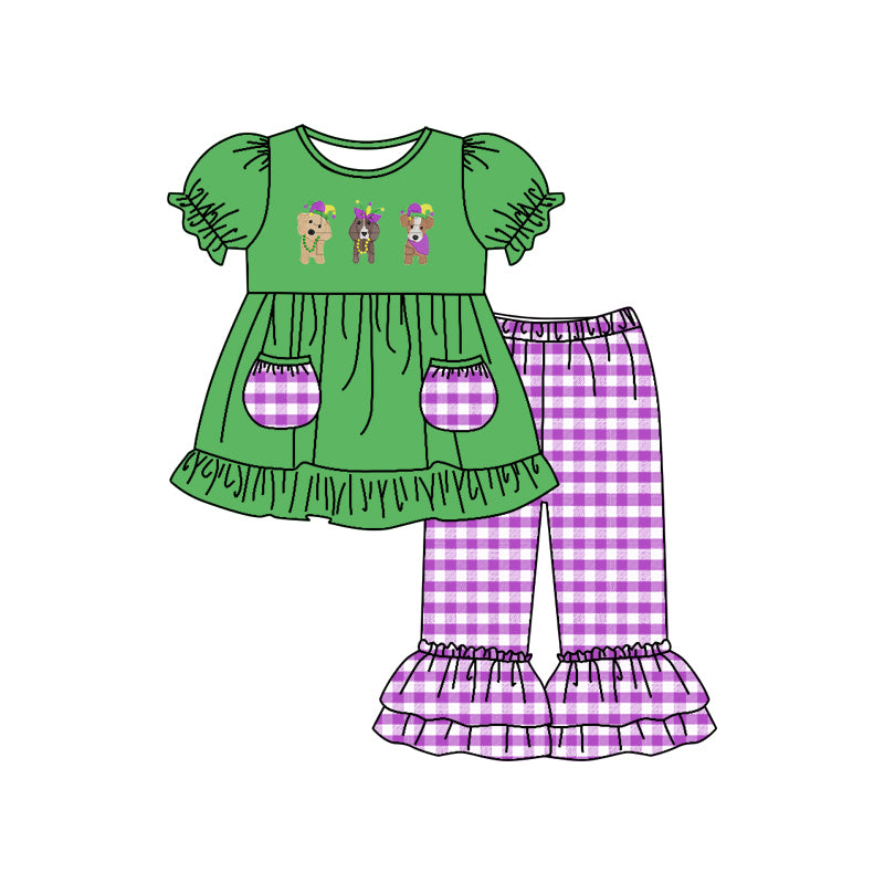 (Custom Design MOQ 5) 3 Dog Print Top Plaid Pants Girls Pockets Mardi Gras Clothes Set