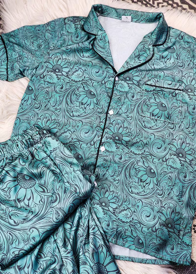 (Custom Design MOQ 5) Adult Blue Print Woman Summer Pajamas Clothes Set