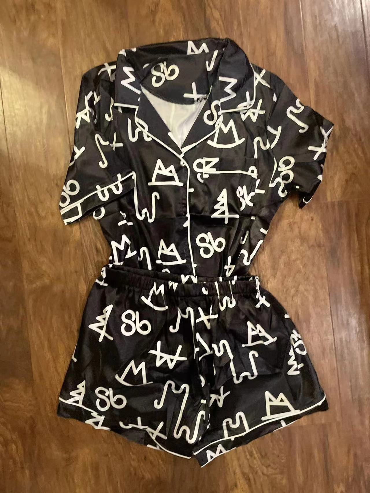 (Custom Design MOQ 5) Adult Letter Black Print Woman Summer Pajamas Clothes Set