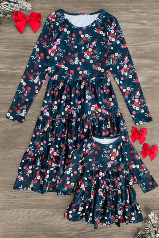 (Custom Design MOQ 5) Adult Navy Flowers Print Woman Knee Length Dress