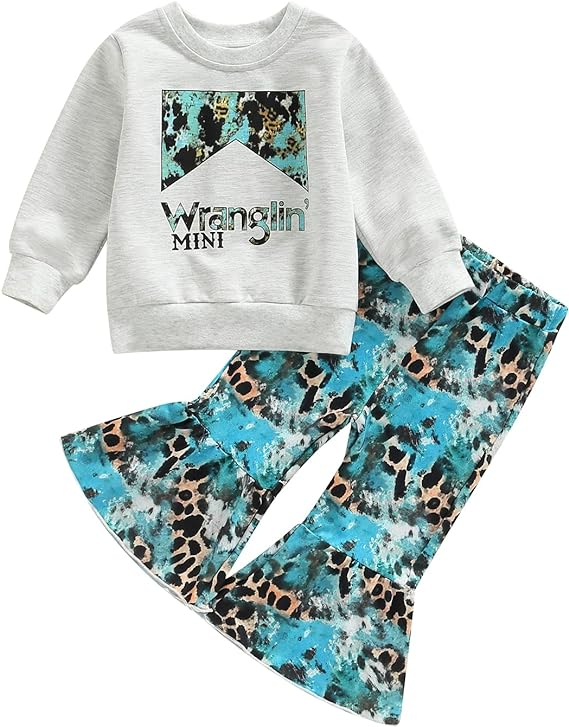 (Custom Design MOQ 5) Aqua Cow Leopard Print Girls Bell Pants Western Clothes Set
