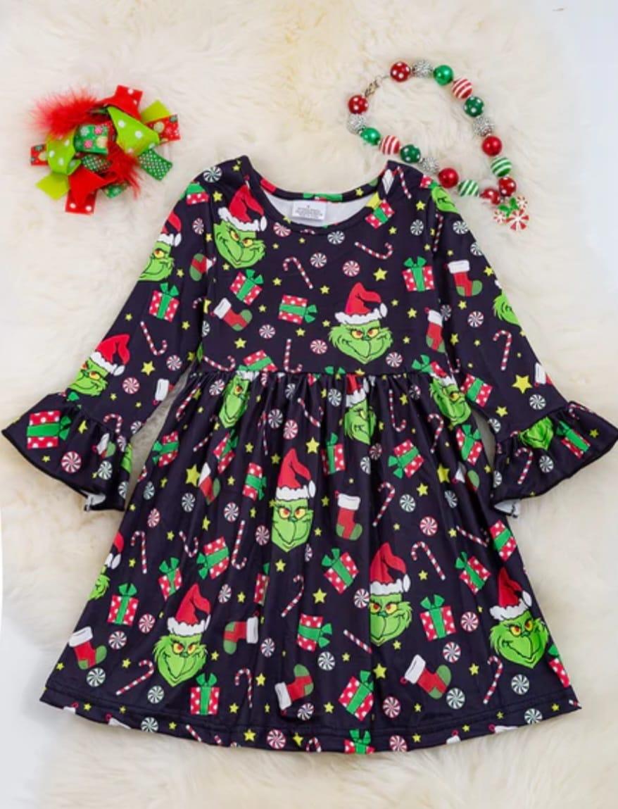(Custom Design MOQ 5) Black Christmas Frog Print Girls Knee Length Dress
