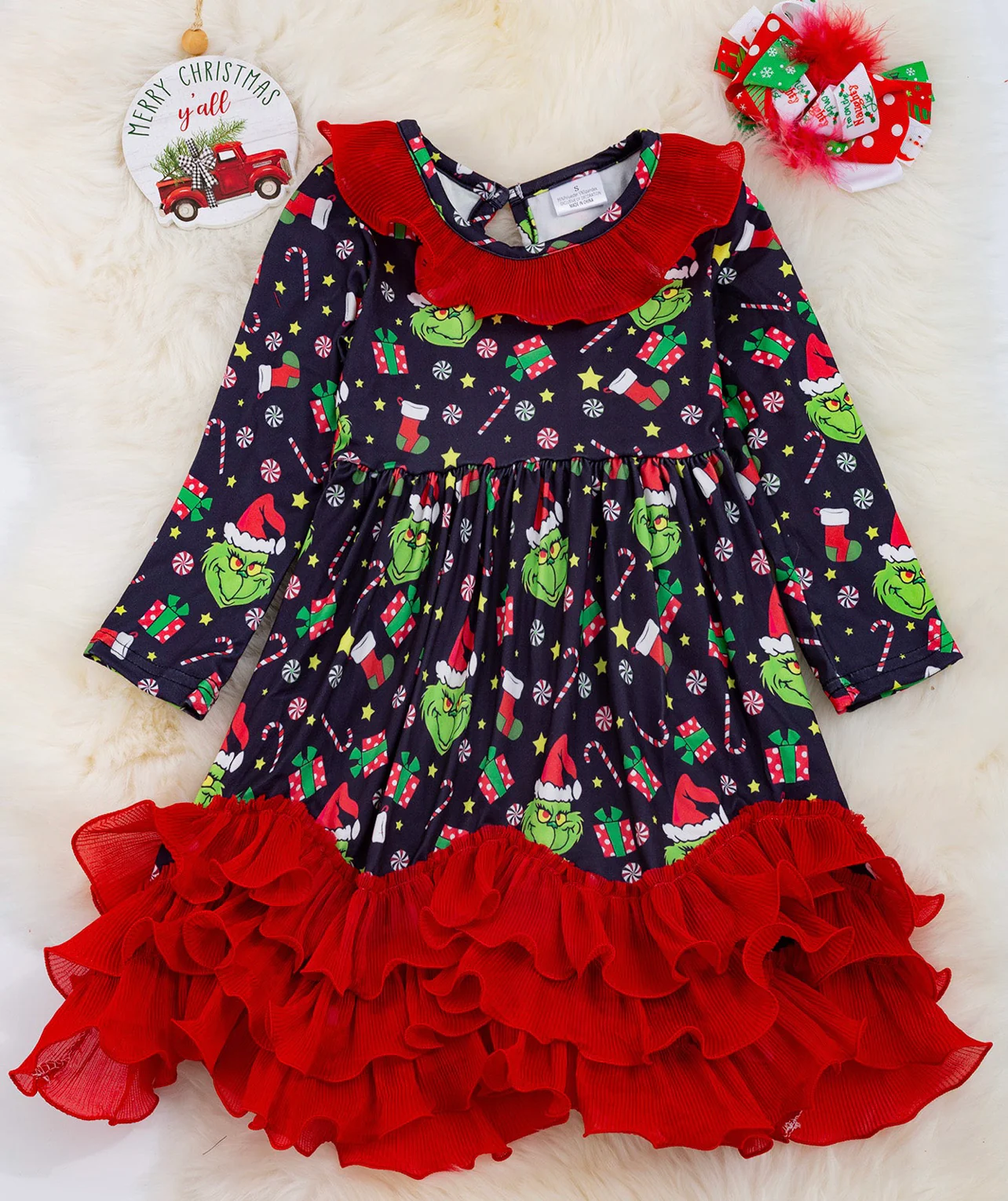 (Custom Design MOQ 5) Black Christmas Frog Print Red Ruffles Ankle Length Dress