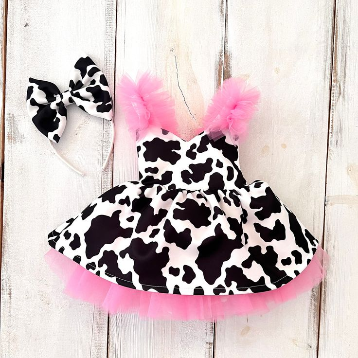 (Custom Design MOQ 5) Black cow print pink tulle baby girls knee length dress