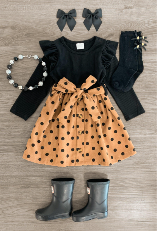 (Custom Design MOQ 5) Black Top Dots Girls Fall Knee Length Dress