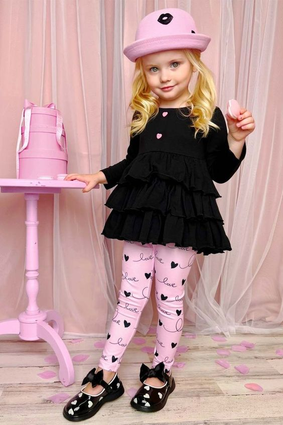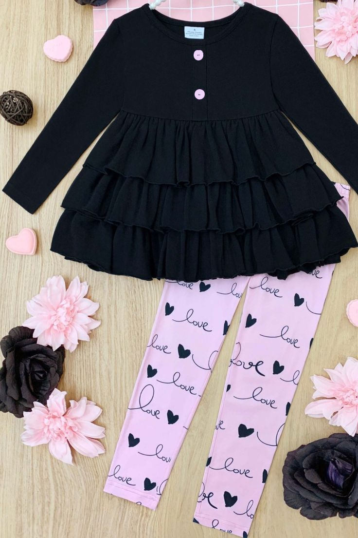 (Custom Design MOQ 5) Black Tunic Top Pink Legging Pants Girls Valentine's Clothes Set