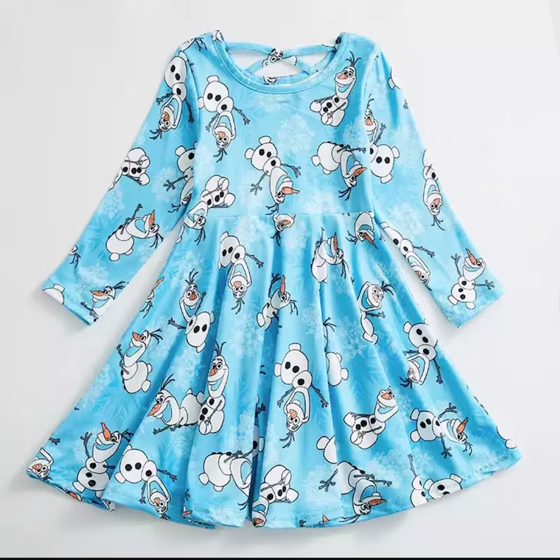 (Custom Design MOQ 5) Blue cartoon snowman print knee length dress