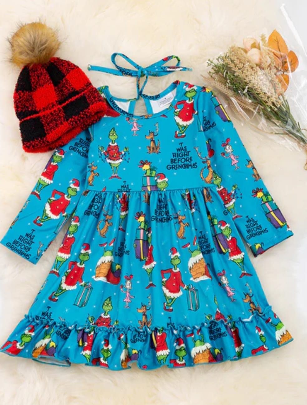 (Custom Design MOQ 5) Blue Christmas Frog Print Girls Knee Length Dress
