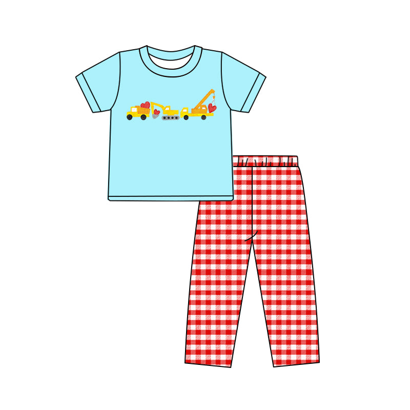 (Custom Design MOQ 5) Blue Construction Heart Print Red Plaid Pants Boys Valentine's Day Clothes Set