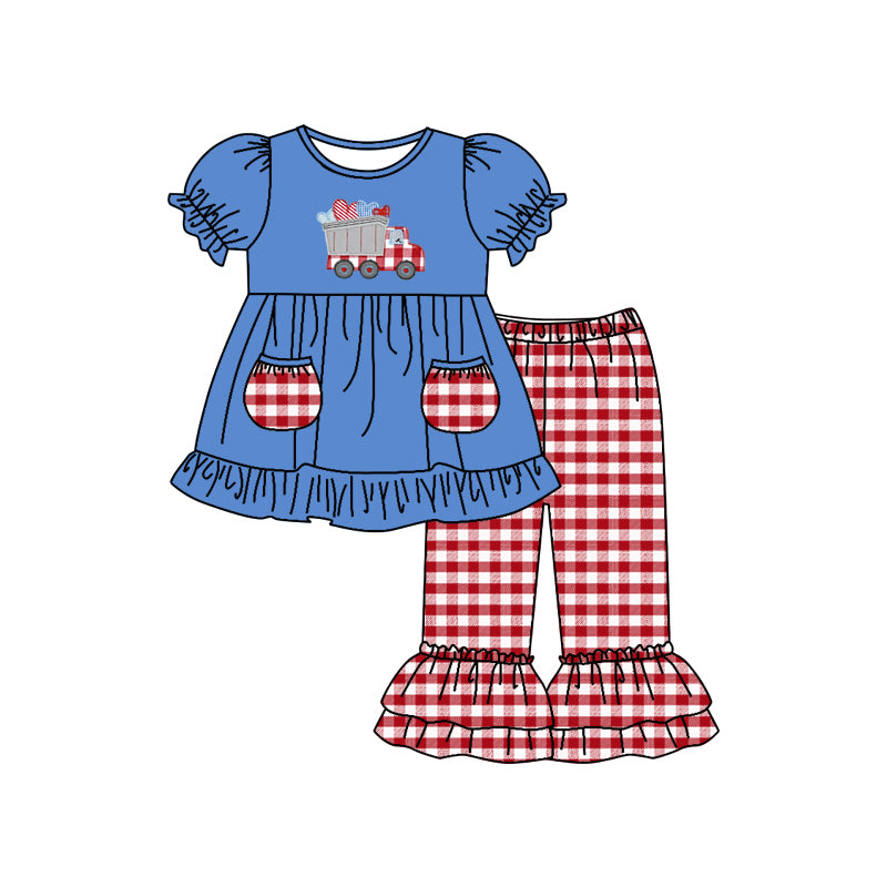 (Custom Design MOQ 5) Blue Construction Heart Print Red Plaid Pants Girls Pockets Valentine's Day Clothes Set