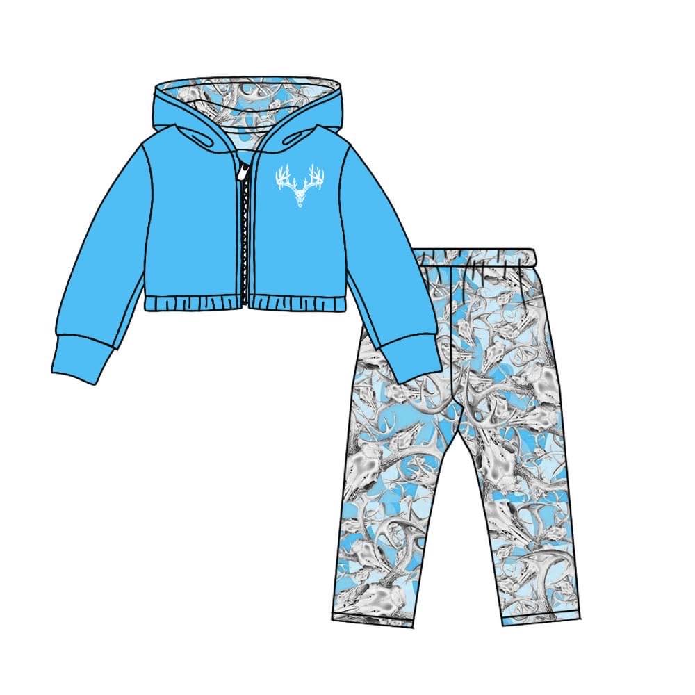 (Custom Design MOQ 5) Blue Deer Print Hoodie Jacket Top Boys Clothes Set