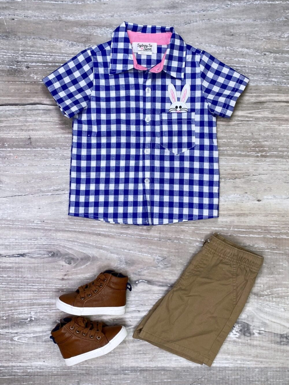 (Custom Design MOQ 5) Blue Plaid Bunny Print Boys Button Tee Shirts Easter Top