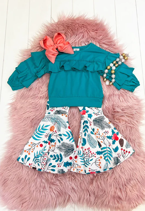 (Custom Design MOQ 5) Blue Ruffle Top Flowers Bell Pants Girls Christmas Clothes Set