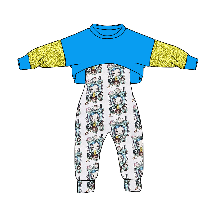 (Custom Design MOQ 5) Blue Top Cartoon Coraline White Jumpsuit Girls Halloween Clothes Set