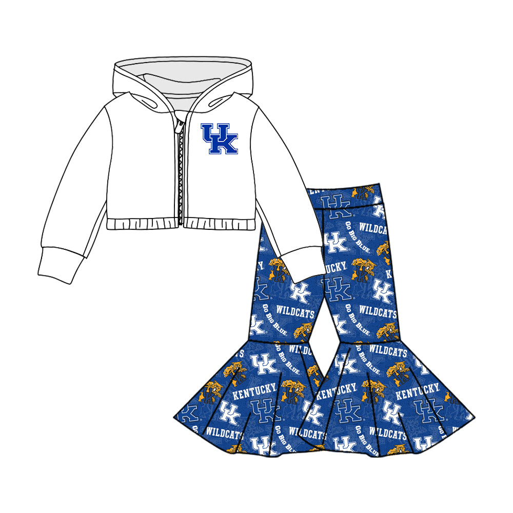(Custom Design MOQ 5) Blue UK Football Team's Print Bell Pants Hoodie Jacket Top Girls Clothes Set