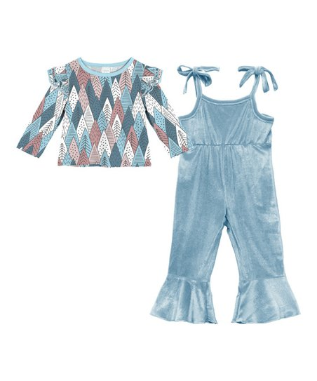 (Custom Design MOQ 5) Blue Velvet Overall Girls Fall Jumpsuit Clothes Set