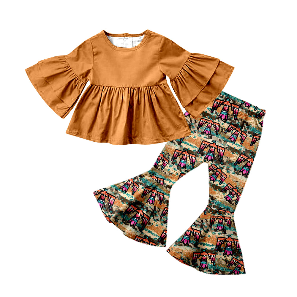 (Custom Design MOQ 5) Borwn Western Bird Print Girls Clothes Set