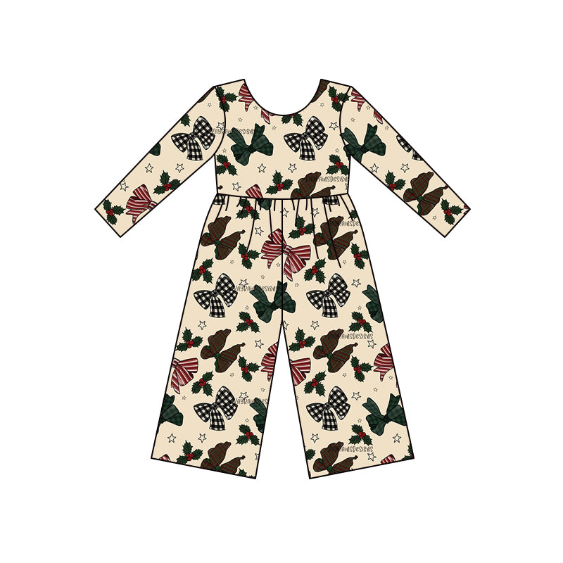 (Custom Design MOQ 5) Bows Holly Print Girls Christmas Jumpsuits