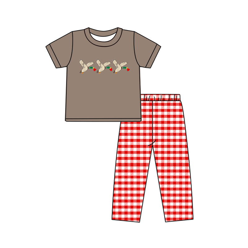 (Custom Design MOQ 5) Brown Duck Heart Print Red Plaid Pants Boys Valentine's Day Clothes Set
