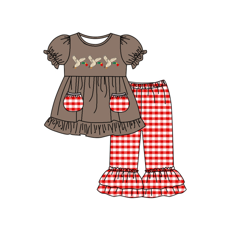 (Custom Design MOQ 5) Brown Duck Heart Print Red Plaid Pants Girls Pockets Valentine's Day Clothes Set
