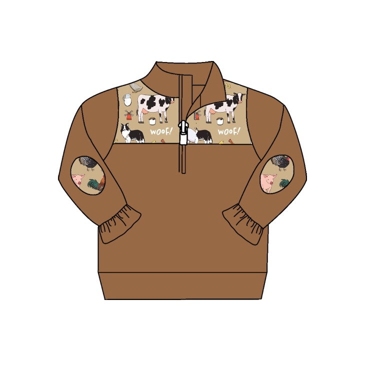 (Custom Design MOQ 5) Brown Farm Animals Zip Pullover Girls Tee Shirts Top