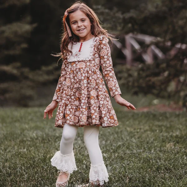 (Custom Design MOQ 5) Brown flowers tunic top white ruffles legging pants girls fall clothes set