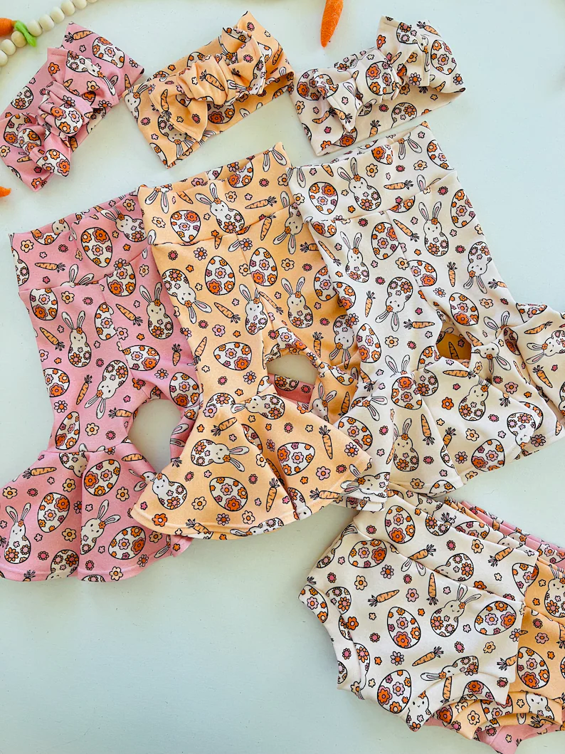 (Custom Design MOQ 5) Bunny Carrot Flowers White Print Baby Girls Easter Bummie Shorts