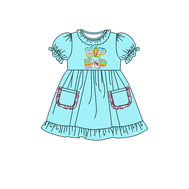 (Custom Design MOQ 5) Bunny Hop Hop Print Girls Pockets Easter Knee Length Dress