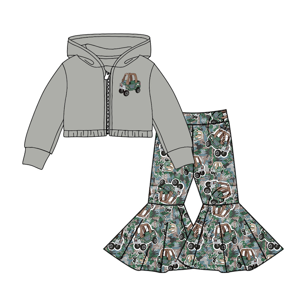 (Custom Design MOQ 5) Camo Truck Print Hoodie Jacket Top Bell Pants Girls Clothes Set