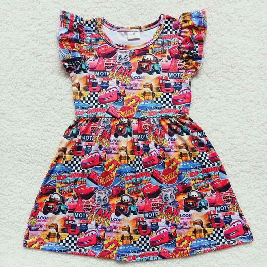 (Custom Design MOQ 5) Cartoon car print girls knee length dress