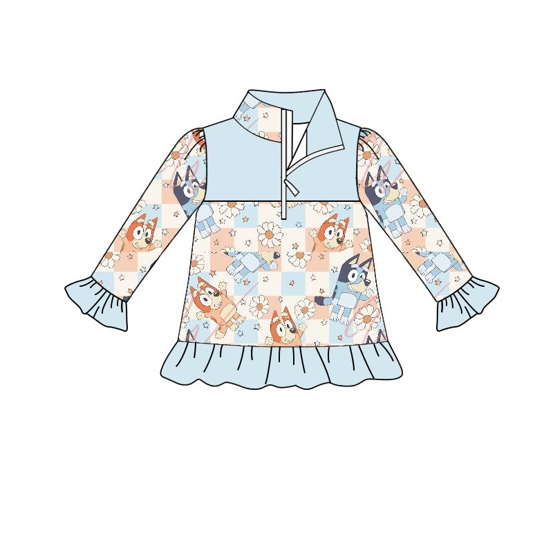 (Custom Design MOQ 5) Cartoon Dog Flowers Blue Print Zip Pullover Girls Tee Shirts Top