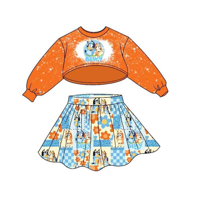 (Custom Design MOQ 5) Cartoon Dog Orange Long Sleeve Top Skirts Girls Clothes Set