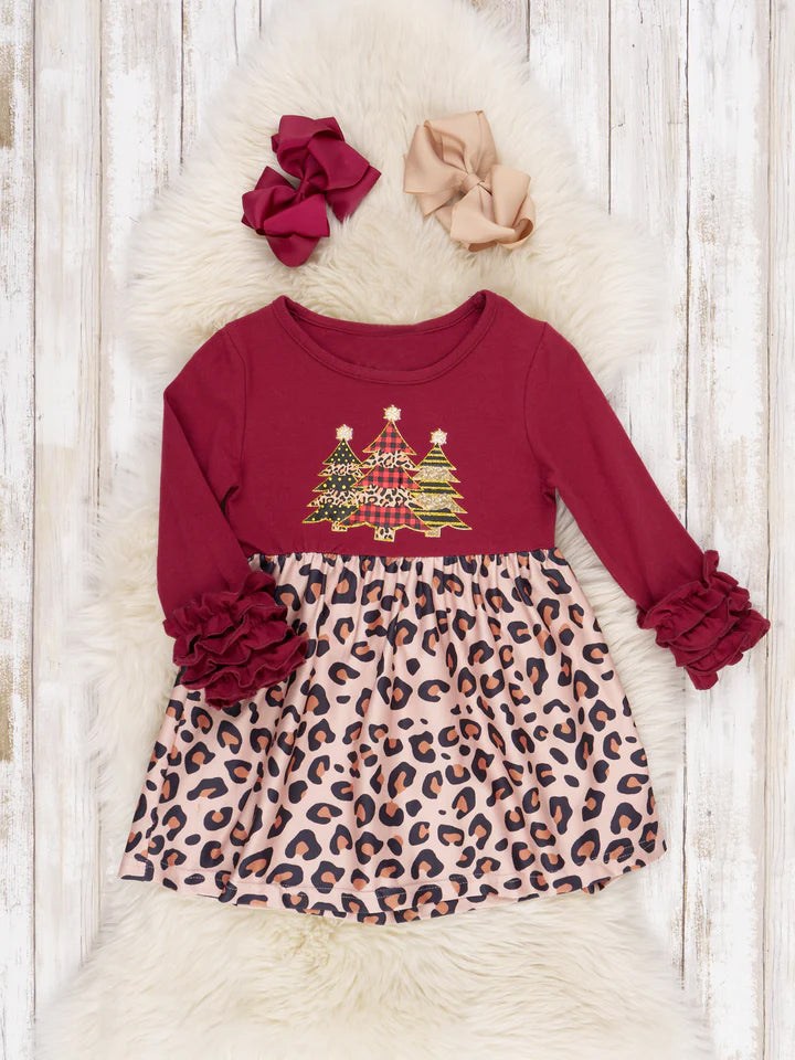 (Custom Design MOQ 5) Christmas Leopard Tree Girls Knee Length Dress