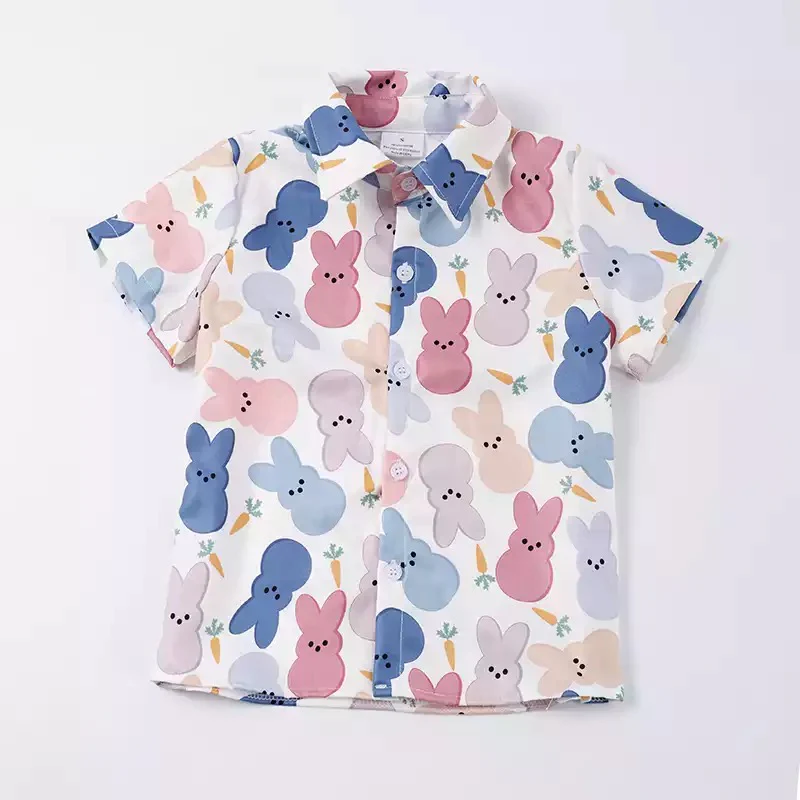 (Custom Design MOQ 5) Colorful Bunny Print Boys Buttons Tee Shirts Easter Top