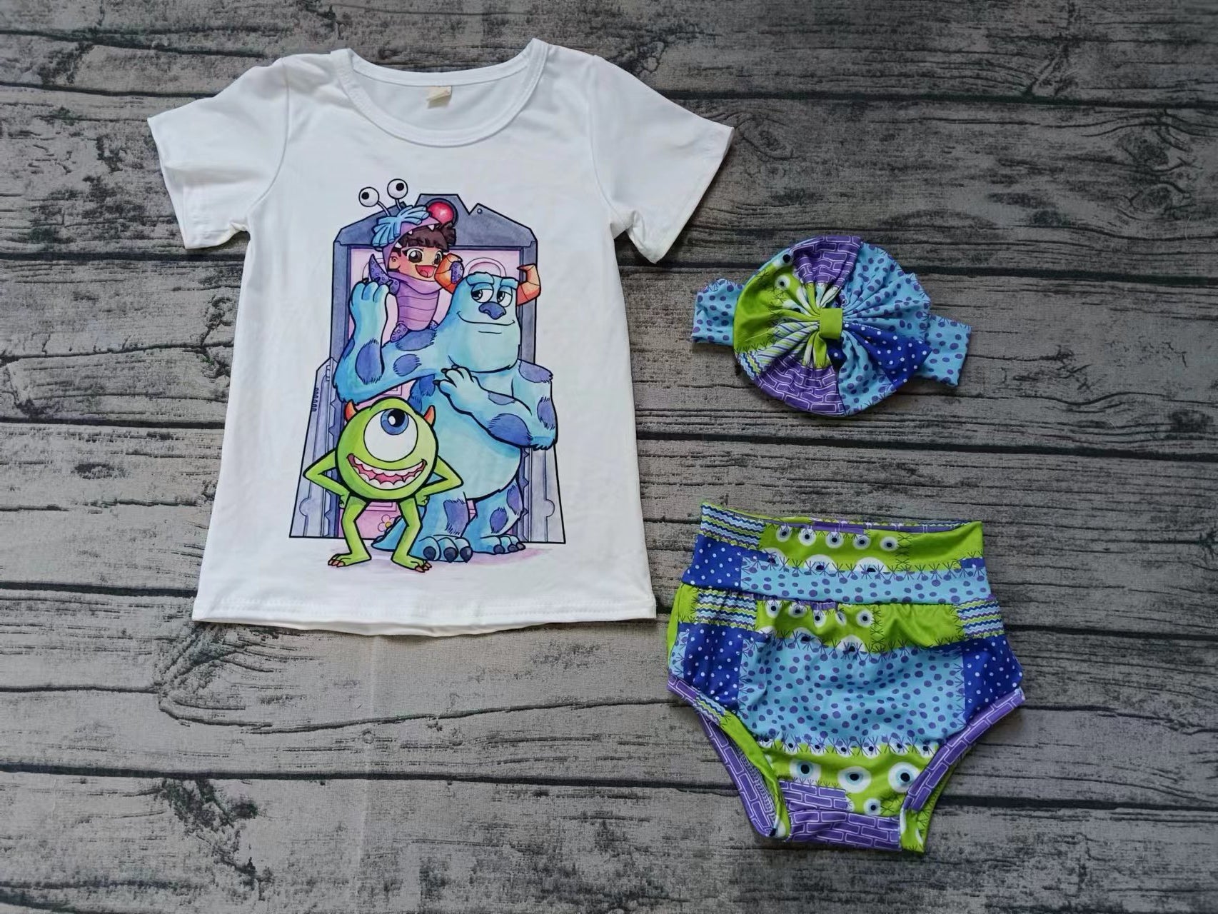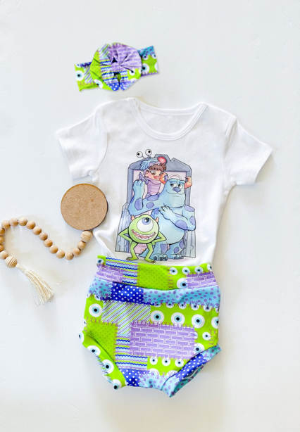 (Custom Design MOQ 5) Cute Monster Print Baby Girls Summer 3 Pieces Bummie Sets