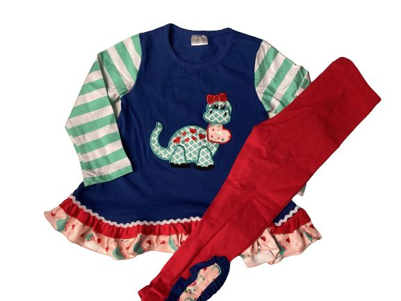 (Custom Design MOQ 5) Dinosaur Heart Ruffles Top Legging Pants Valentine's Girls Clothes set