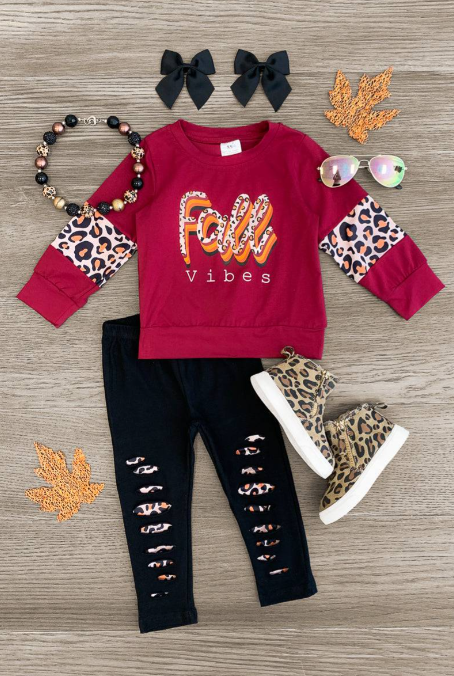 (Custom Design MOQ 5) Fall Vibes Wine Top Leopard Hole Legging Pants Girls Fall clothes set