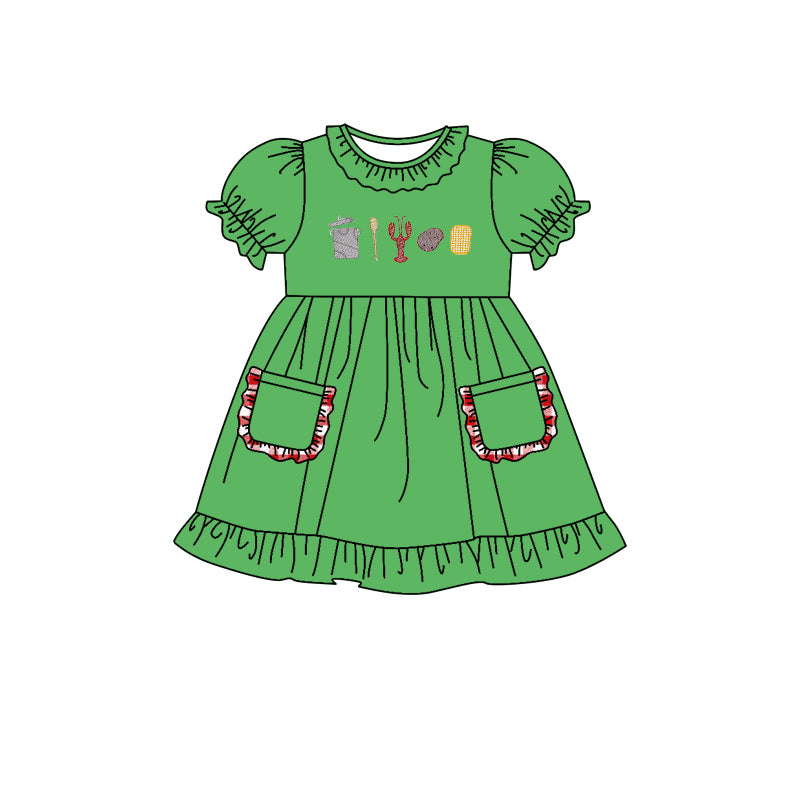 (Custom Design MOQ 5) Green Crawfish Print Girls Pockets Knee Length Dress